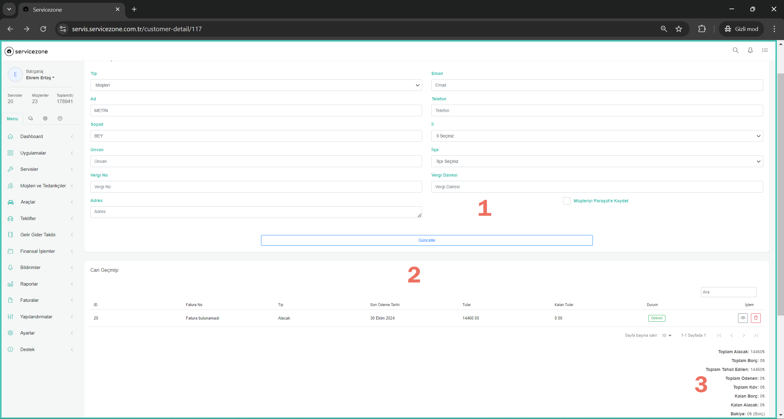 - 5.Müşteriyi ServiceZone'de Görüntülemek İçin Buton: Müşteri detaylarını ServiceZone üzerinden görüntülemek için kullanılan buton.