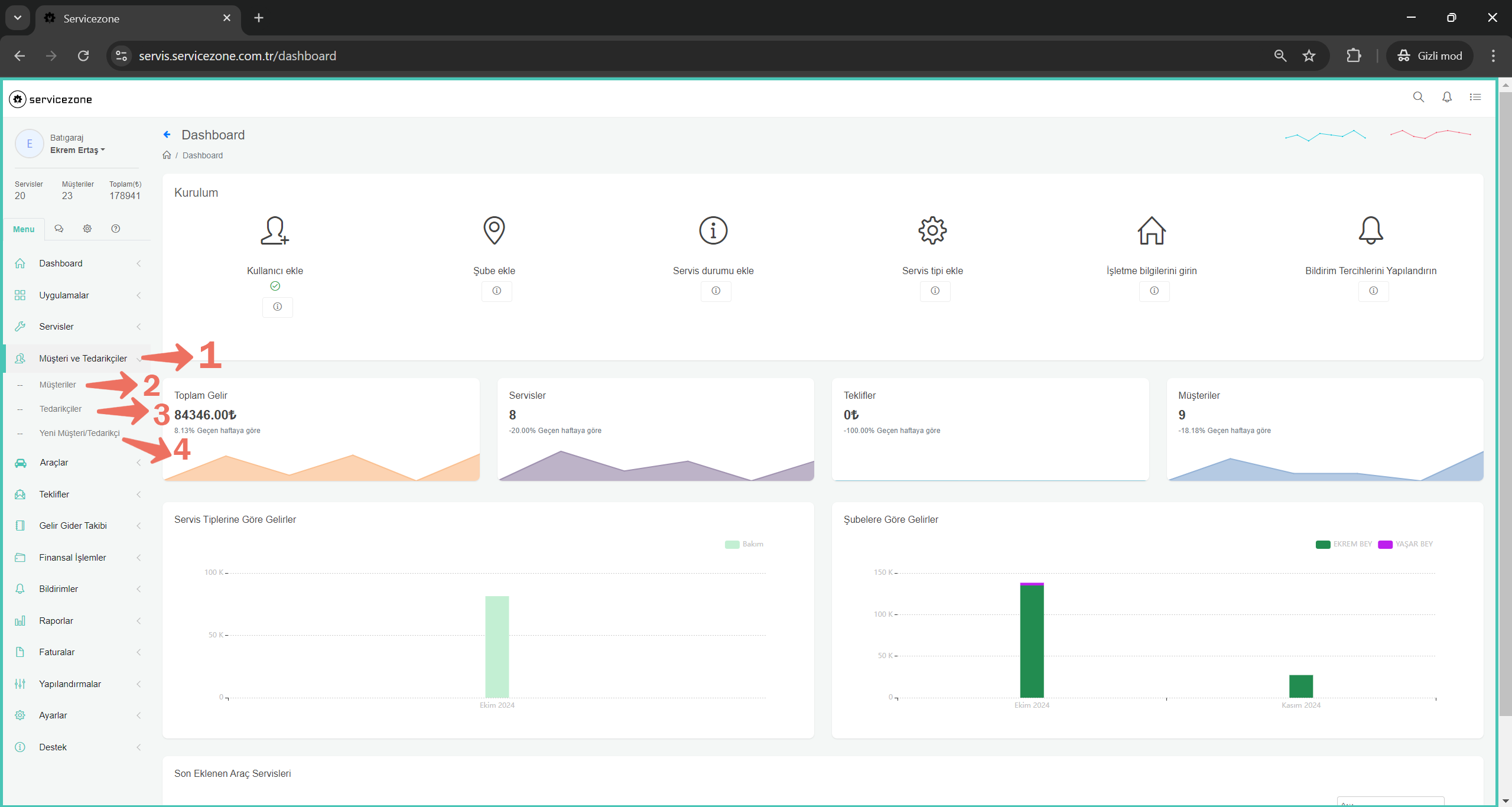 - Şube Oluşturma: "Yeni şube adı: Aydın Servis"