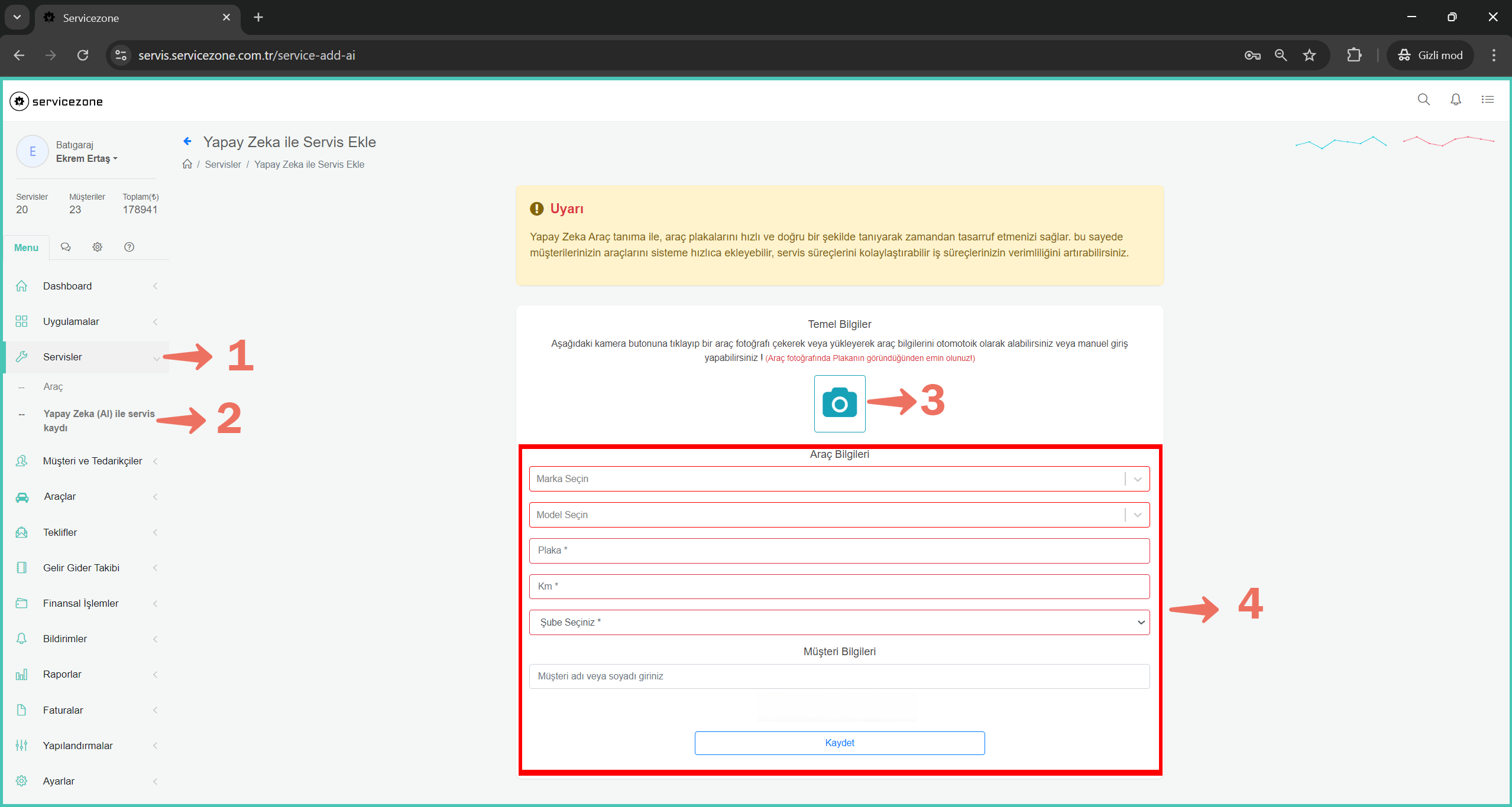 - Servis Kaydı Oluşturma: "Müşteri adı: Ahmet, soyadı: Demir, araç markası: Ford, model: Fiesta, plaka: 34ABC123, kilometre: 15000, şube: İstanbul Servis"